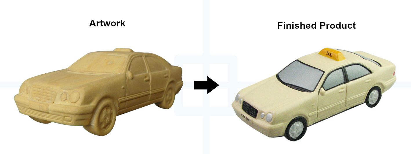 We constantly develop new special Squeezie forms for our customers. The process begins with an idea or sketch. In the first step, a handmade pattern is created with gypsum. This pattern is used for creating the mould. Once the mould is made, it is filled with silicone which hardens and forms the item. Then, the anti-stress balls are painted and possibly printed. Afterwards, they are finally packed.